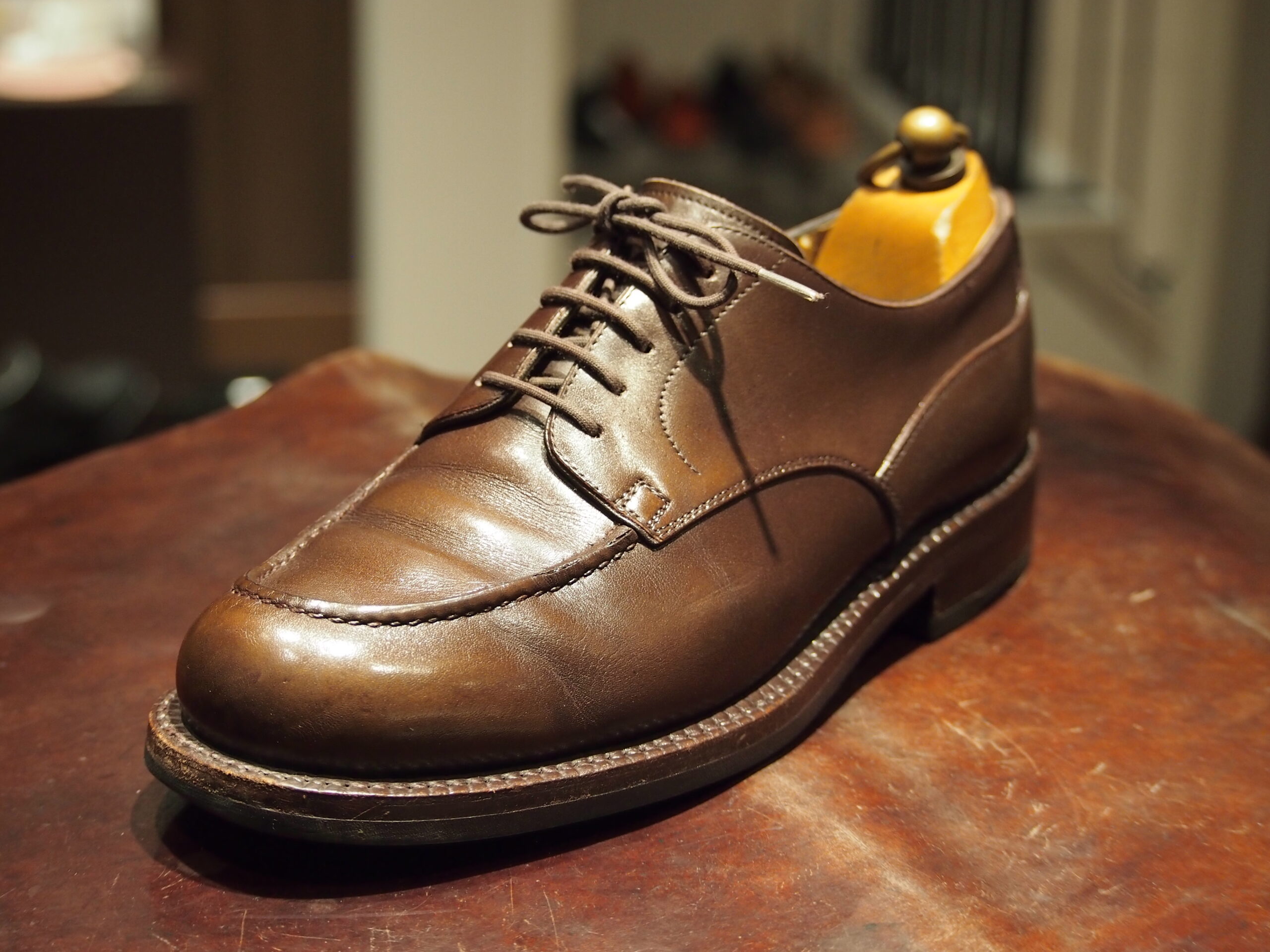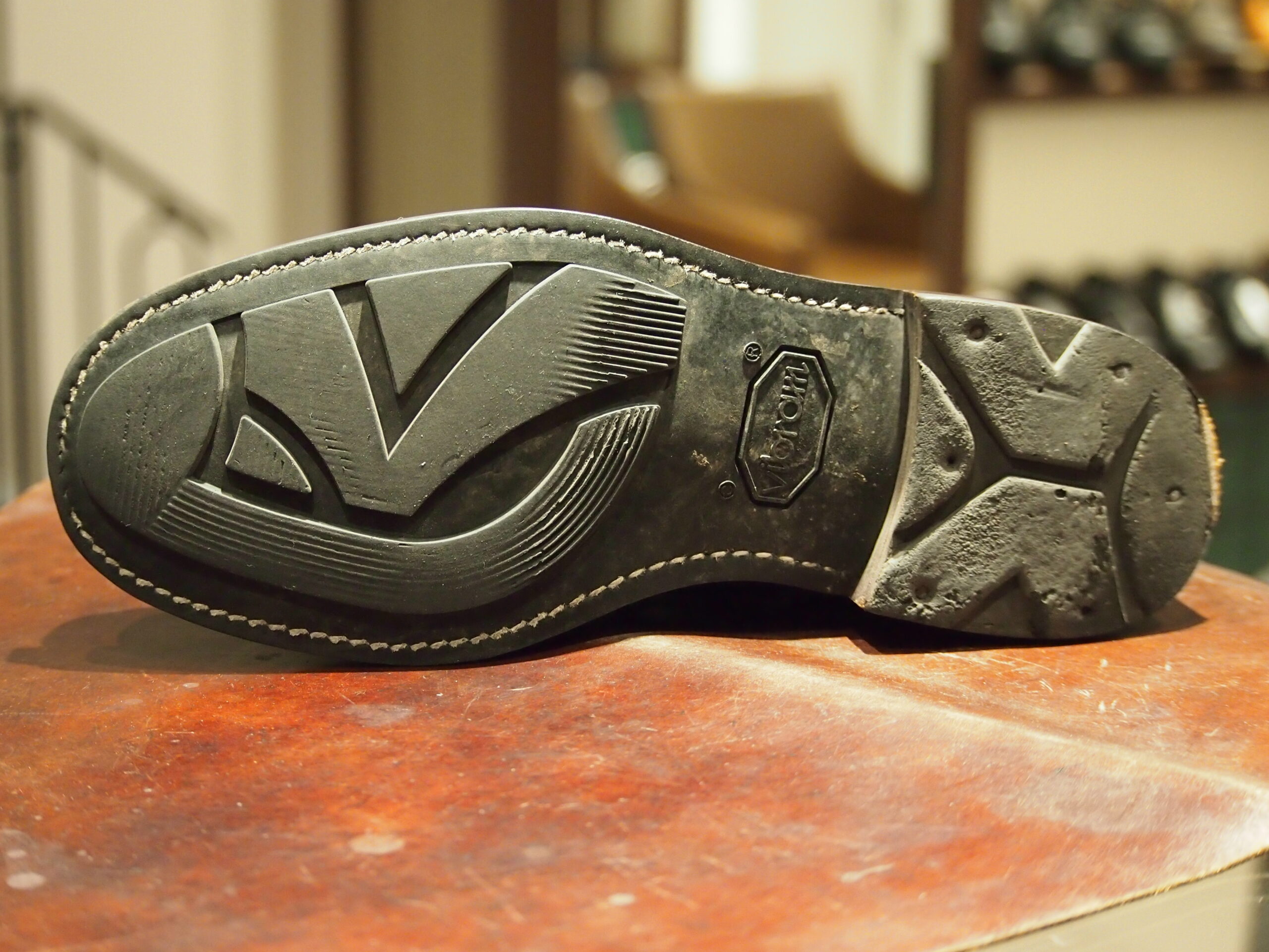 張り出したコバ、分厚いソール、エイジングした革・・・